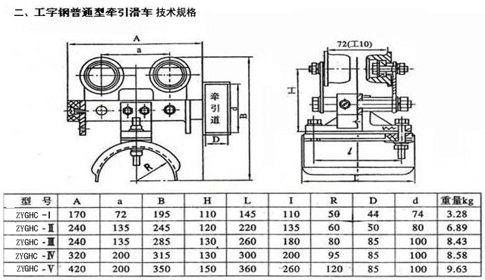 ZYGHC型工字鋼電纜滑車系列分為中載荷型、重載荷型和輕載荷型,因此滑車行走輪為Φ80、Φ63、Φ50的三種。承載能力<50~150kg,每類按托板層數(shù)分為單層、雙層、三層,每類中有三種形式。首端為電纜牽引車,終端為固定掛線架,中間為電纜滑車,該系列滑車分Ⅰ、Ⅱ、Ⅲ、Ⅳ、Ⅴ五種型號,如用戶采用12#、14#、16#或更大號數(shù)工字鋼,可在訂貨時(shí)注明,本公司可成套供貨。