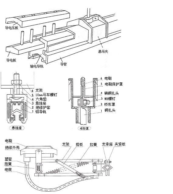 ?單極組合式滑觸線導(dǎo)電器:為接簧支撐式,僅在滑觸線下部即可推入,但須在牽引器同步進(jìn)行,并保證拉簧力量適當(dāng),以免加大電刷磨損。牽引器與導(dǎo)電器同步進(jìn)行,可用螺栓或電焊方式固定在行車等移動(dòng)電器上,并適當(dāng)保證導(dǎo)電器運(yùn)行不受扭力。